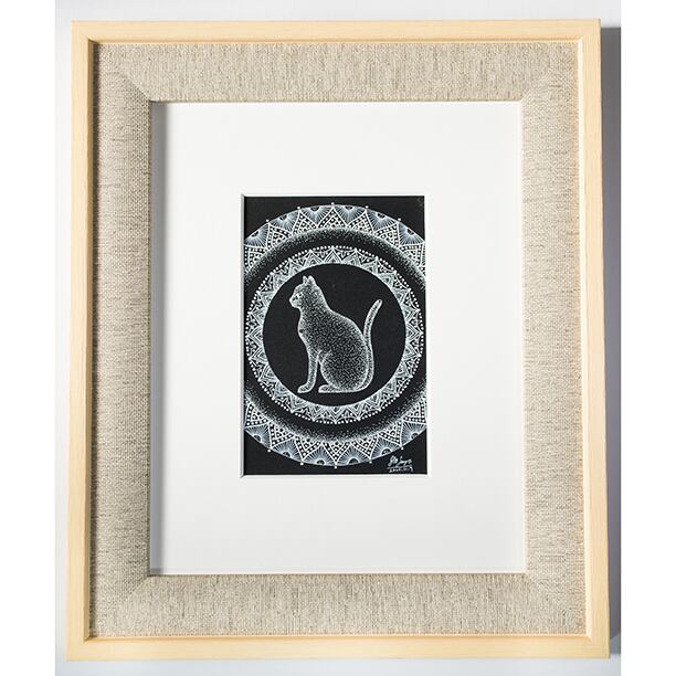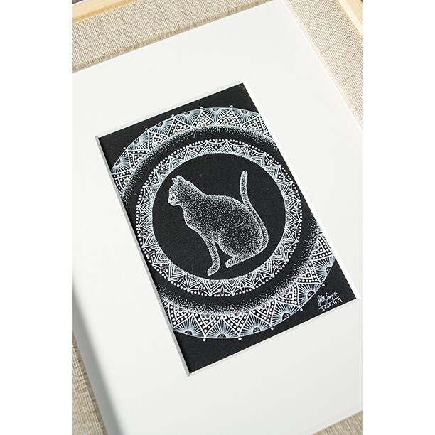 2重の円の曼荼羅アートの中央に白猫が左向きに鎮座しています。