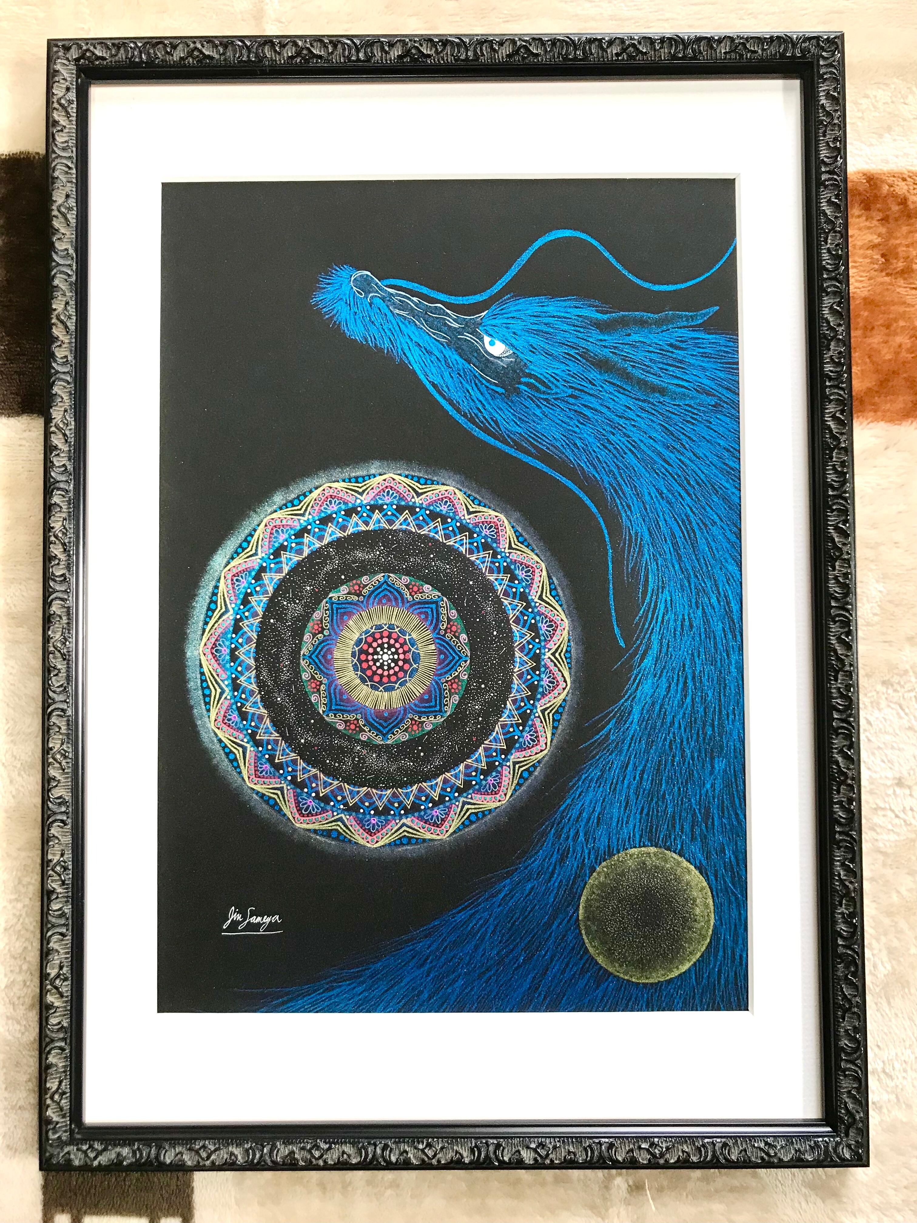 尊厳と力強さを象徴する「青龍」と宇宙を表す「曼荼羅アート」絵画作品、原画です。